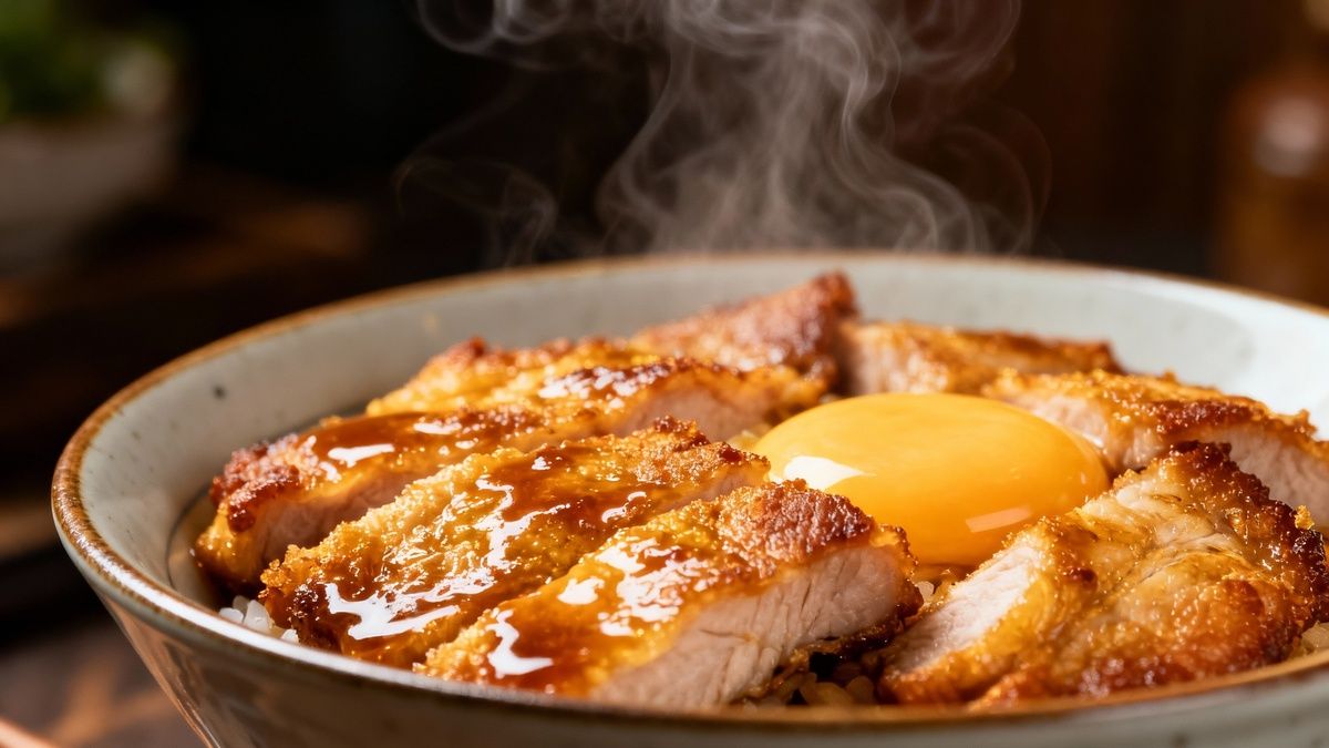 Подача проста: горячий рис в миске, сверху ломтики свинины с жидковатой яичной массой, постепенно поливаем оставшимся соусом. Всё подается сразу, чтобы вкус и текстура сохранялись на максимум, создавая ощущение домашнего японского ужина.