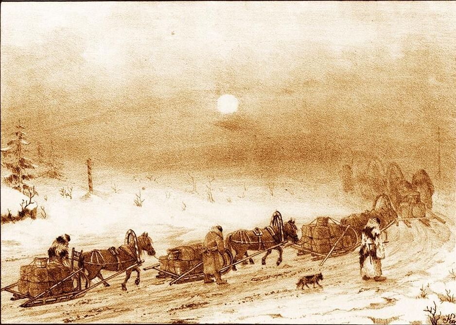 Павел Кошаров (1824-1902), художник и выдающийся график, переехал в Томск в 1854 году и начал создавать "Художественно-этнографические рисунки Сибири". Его работы включали иллюстрации, отображающие зимние перевозки чая.