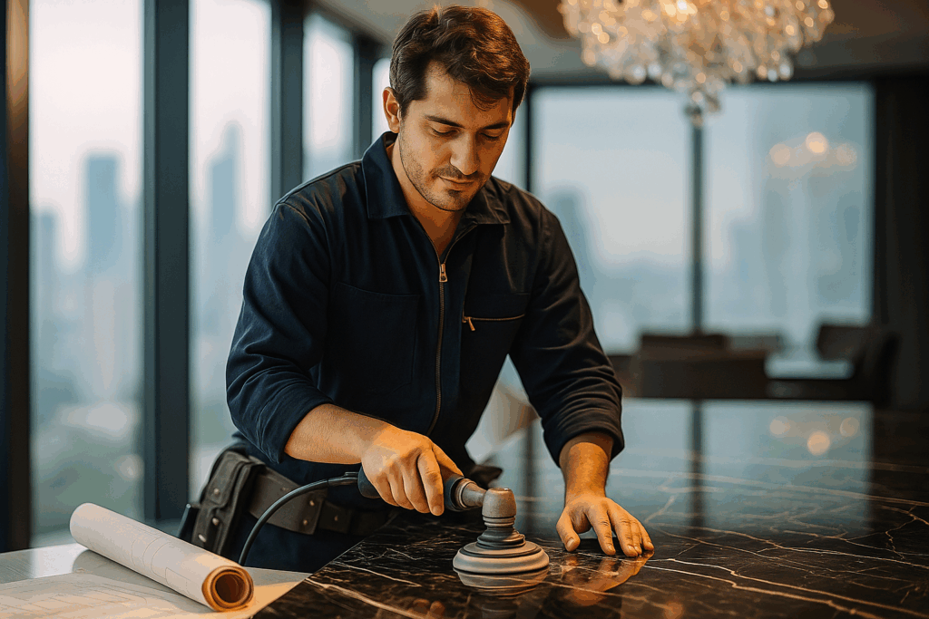 Черная гранитная столешница, заметная своими белыми пятнами, — проблема, знакомая многим владельцам. За прошедший год был успешно восстановлен огромный ассортимент подобных поверхностей в роскошных квартирах и ресторанах Москвы. Основные причины, как правило, едины: неподобающий уход и отсутствие защиты. Если не решать эту проблему вовремя, столешница может потерять свой вид, а затраты на реставрацию превзойдут стоимость профилактических мероприятий. Разберем, что происходит с черным гранитом и какие шаги помогут восстановить его без замены.