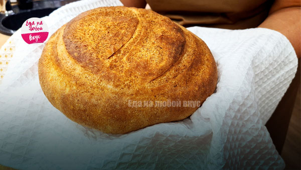 Свежеприготовленное тесто выкладываем на поверхность, формируем его в шар и оставляем отдыхать в форме или миске, накрыв полотенцем на 50 минут. После этого выпекаем хлеб: сначала 10 минут при высокой температуре, а затем снижаем до 200-190 градусов, пока не появится румяная корочка.