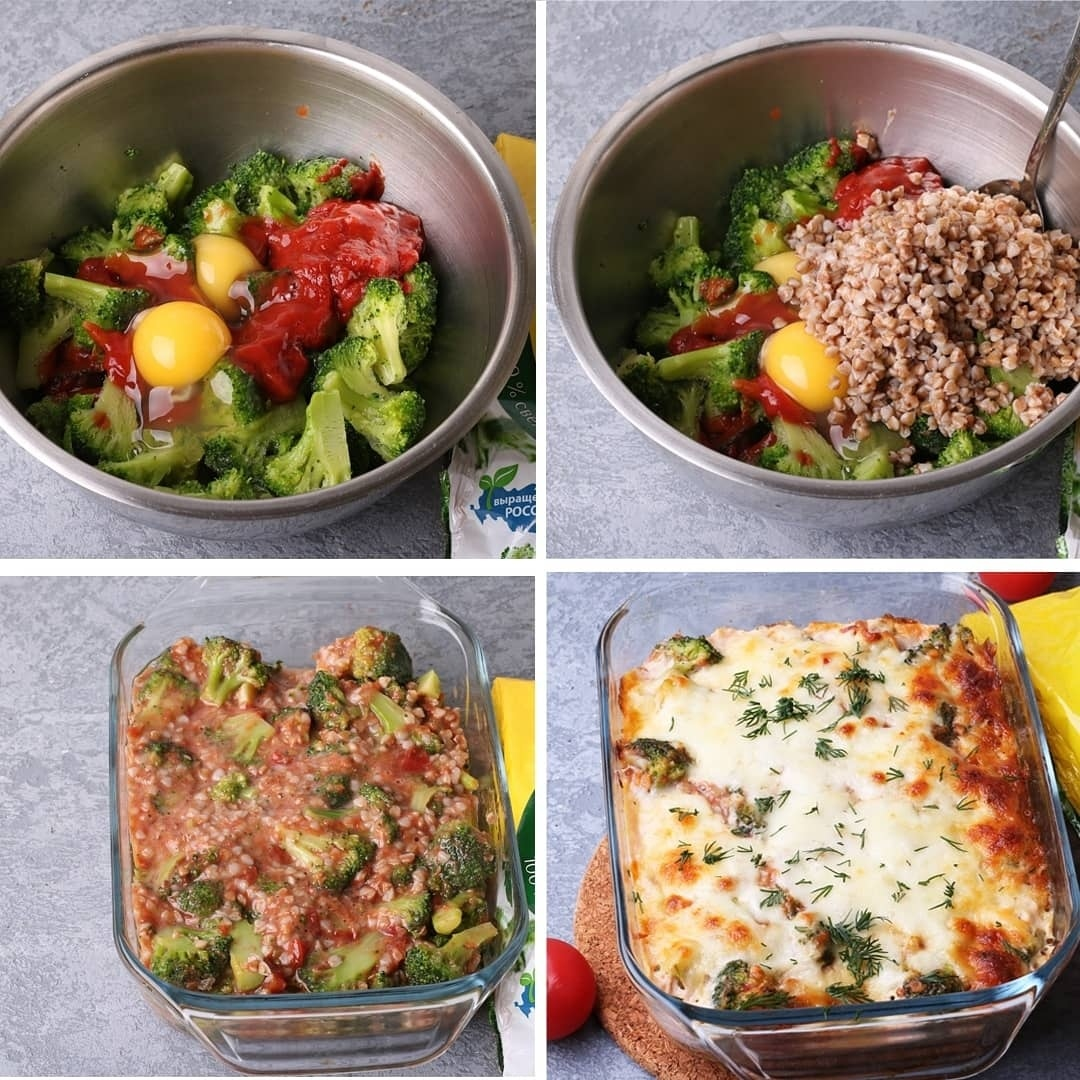 Следующие шаги подготовки: добавьте к брокколи яйца, томатный соус (или протертые томаты) и вареную гречку. Тщательно перемешайте ингредиенты, чтобы они хорошо соединились, и выложите массу в заранее подготовленную форму для запекания.