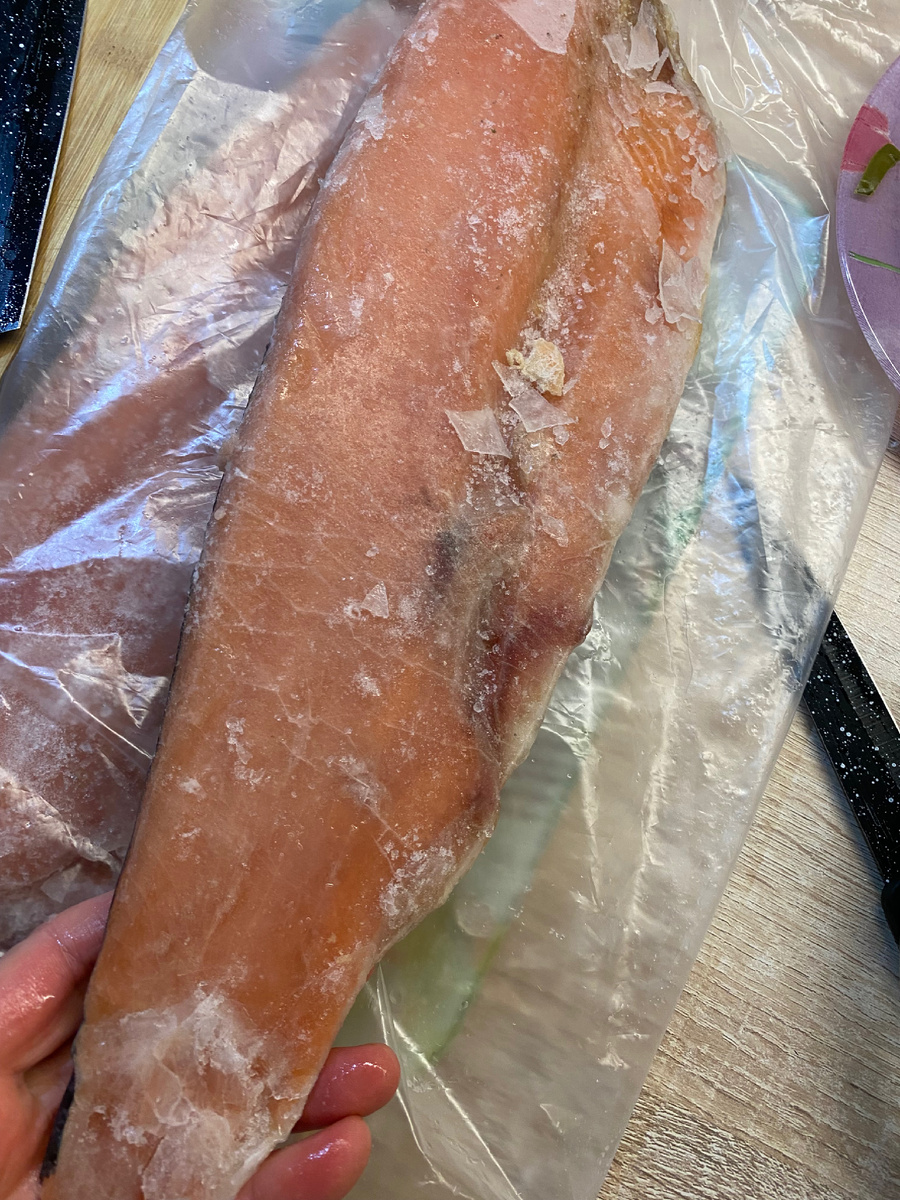 Возвращаясь обратно, была необходимость заглянуть в магазин за филе рыбки. Хотя в морозилке уже имелись заготовки, желание попробовать новый рецепт только усиливалось. После разморозки филе, оно было нарезано на порционные кусочки и обжарено с одной стороны в муке. Затем к рыбе была добавлена порезанная луковица, предварительно присыпанная содой — это помогает ей быстрее стать мягкой.
