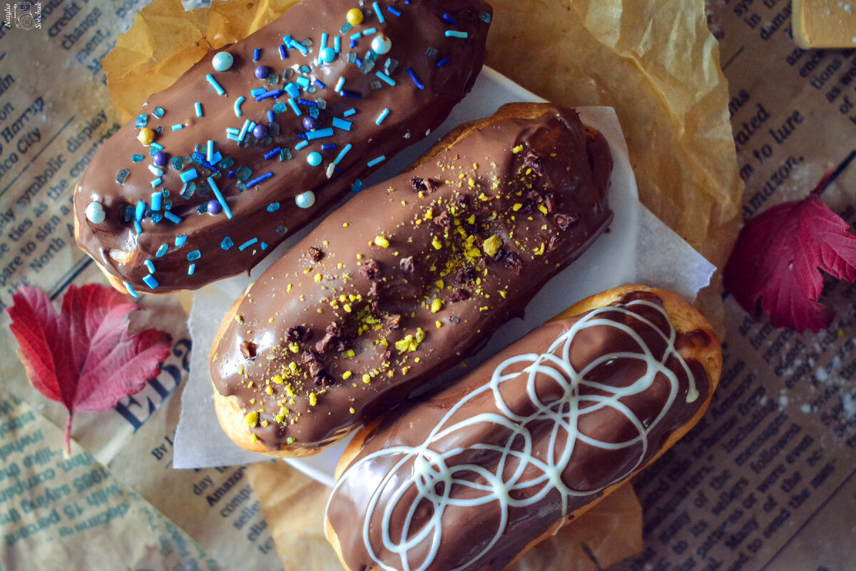 Для крема: доведите молоко до кипения. В отдельной миске взбейте яйца с сахаром, добавьте муку и крахмал, хорошо перемешайте. Затем, понемногу вливая тёплое молоко, готовьте на огне, постоянно помешивая. Как только масса загустеет, переложите в миску, прикройте пленкой и охладите. Затем в смеси взбейте мягкое масло и постепенно добавьте заварную основу. Используйте кондитерский мешок, чтобы заполнить пирожные кремом и полить их растопленным шоколадом.