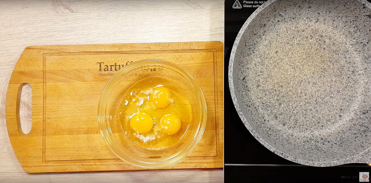 Итак, начнем с яйца. Три яйца разбиваются в глубокую миску, к ним добавляется немного соли и тщательно взбалтываются. Получившуюся массу выливаем на предварительно разогретую сковороду, смазанную растительным маслом, и жарим до золотистой корочки с обеих сторон.