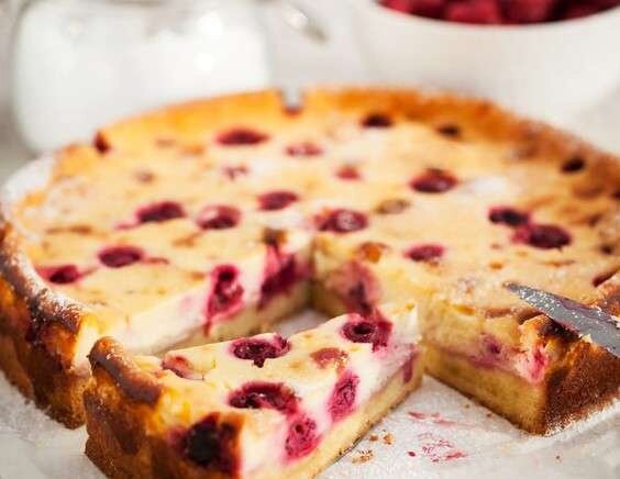 Предварительно запекать тесто в духовке до полуготовности. После этого немного остудить основу, выложить на нее ягоды и залить приготовленной смесью. Выпекать пирог при температуре 170 градусов Цельсия около 30-40 минут, до готовности.