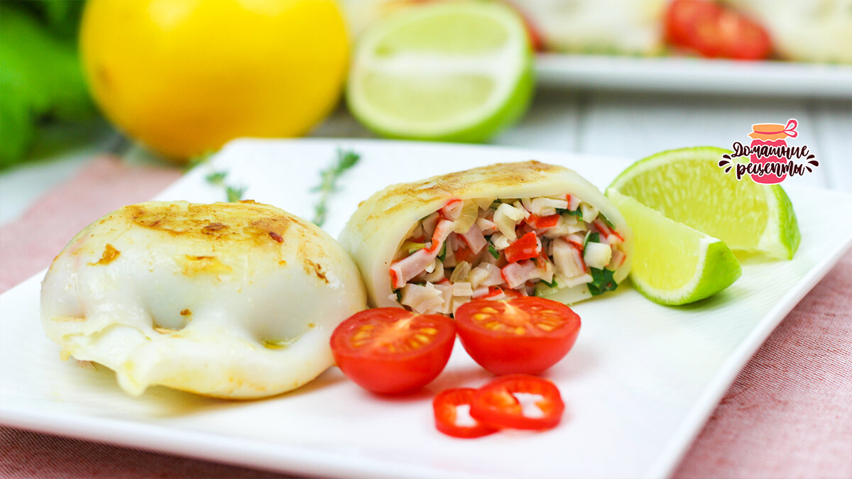 Готовые фаршированные кальмары аккуратно выкладываются на блюдо и подаются с дольками лайма, черри и свежей зеленью. Этот яркий и аппетитный ужин прекрасно дополнит любой стол. Приятного аппетита!