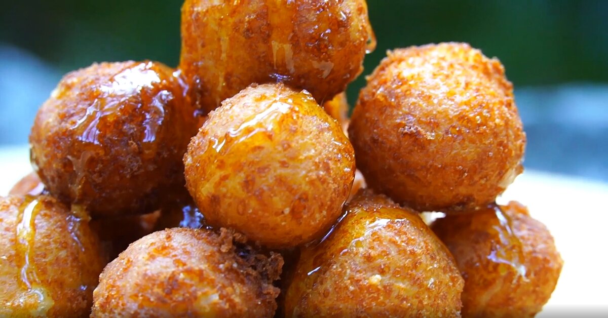 Формируем небольшие шарики — не слишком крупные, чтобы они быстрее приготовились. Разогреваем растительное масло в кастрюле с толстым дном; шарики должны плавать в масле. Обжариваем их на среднем огне до появления аппетитной золотистой корочки. Чтобы избавиться от лишнего масла, готовые изделия переносим на бумажное полотенце, а затем выкладываем на сервировочное блюдо.