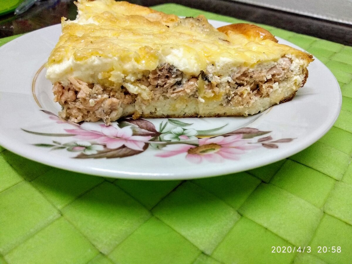 Пока тесто запекается, подготовьте рыбу и натрите оставшиеся 50 г твердого сыра. По истечении 15 минут, достаньте форму, выложите на тесто рыбу, посыпьте тертым сыром и залейте смесью сливок с яйцами. Верните в духовку и выпекайте еще 40 минут. Результат превзойдет все ожидания!