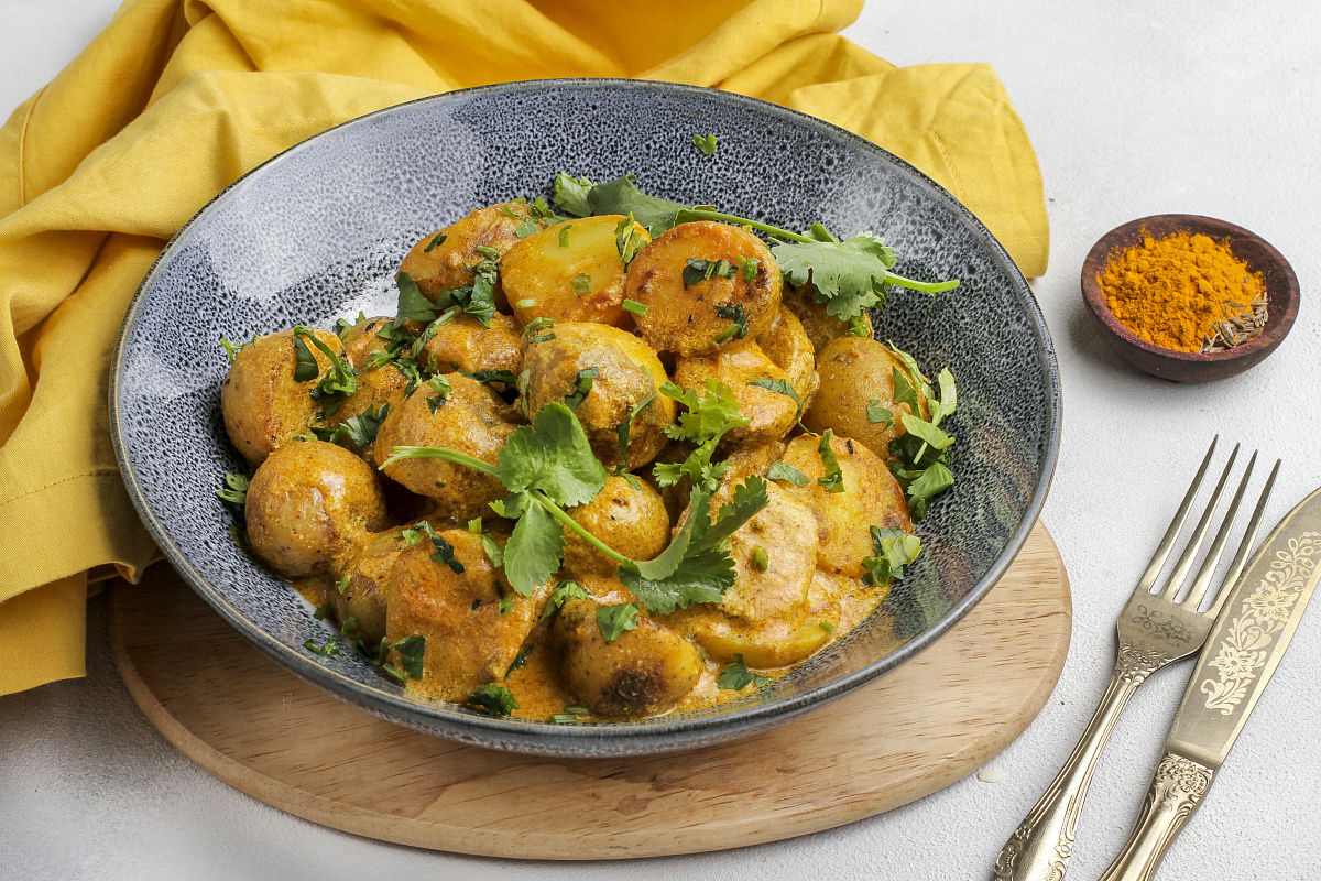 Алурдам — это изысканный вегетарианский вариант карри, приготовленный с картофелем в ароматном соусе. Главная изюминка рецепта — куркума, которая не только окрашивает блюдо в яркий желтый цвет, но и служит основой для дальнейшего добавления множества специй. Среди них кардамон, зира, Гарам Масала, имбирь и гвоздика, создающие гармонию вкусов и ароматов.