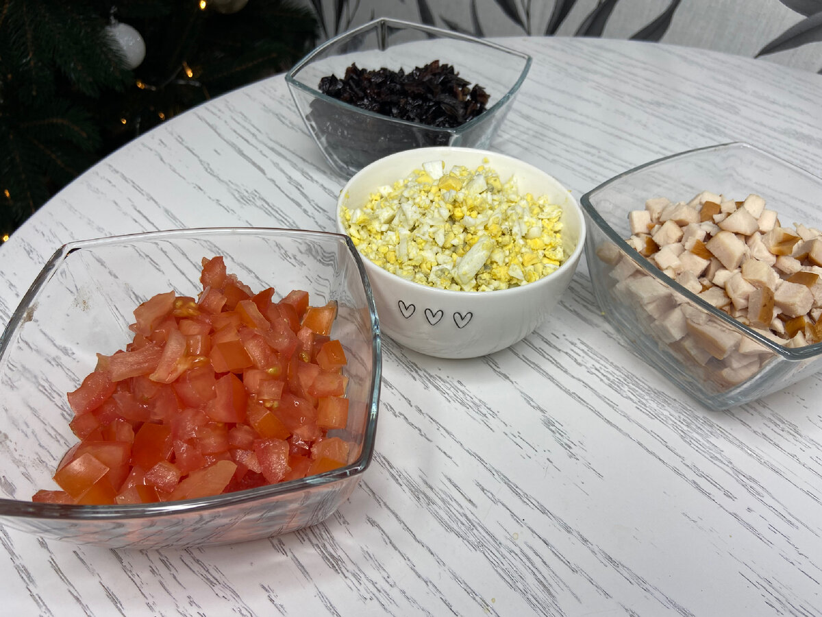 Теперь настало время собрать салат в глубокий салатник, избегая использования формы, чтобы избежать распадения слоёв. Первым слоем выкладывается чернослив. Если хотите, обдайте его кипятком для мягкости, после чего создайте сеточку из домашнего майонеза.