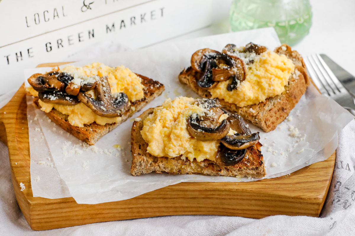 Когда яйца готовы, нарежьте хлеб ломтиками и поджарьте его в сухой сковороде по 30 секунд с обеих сторон. На каждый кусок хлеба выложите скрэмбл, добавьте обжаренные грибы и посыпьте натертым пармезаном. В завершение сбрызните брускетты оливковым маслом с трюфелем, придавая им изысканный вкус, и подавайте к столу.