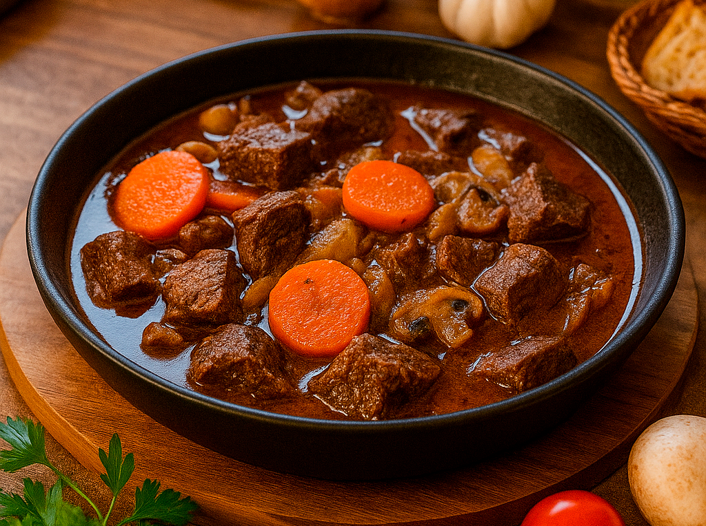 Говядина по-бургундски подается горячей, в глубоких тарелках, с классическим гарниром из отварного картофеля или пасты. Готовьте с любовью, и ваше блюдо станет настоящим украшением стола!