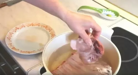 После этого соедините бульон с зажаркой и мясом, добавьте маслины, лавровый лист и немного огуречного рассола. Последнее касается соков лимона и по желанию можно добавить немного лимонного сока за пару минут до готовности.