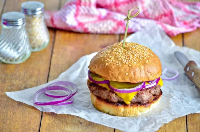 Приступим к сборке бургера! На нижней части булочки намажьте горчицу и добавьте немного томатного соуса. Уложите на него готовую котлету с расплавленным сыром, сверху добавьте лук и огурцы, а затем накройте верхней частью булочки. При желании можно использовать шпажки для лучшей устойчивости бургера. Подавайте его горячим, наслаждаясь насыщенным вкусом и сочной текстурой!