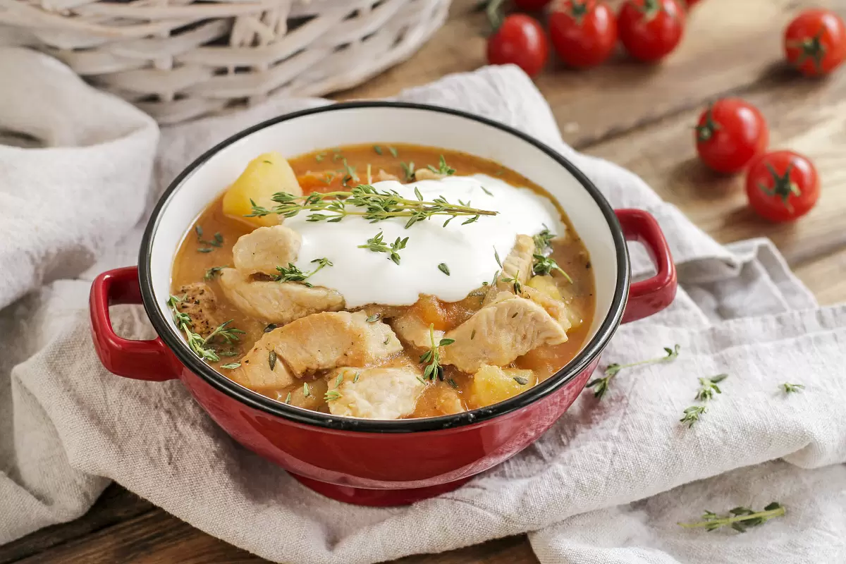 Гуляш — это не просто блюдо, а настоящая кулинарная история, основанная на венгерской традиции. С 18 века оно стало угощением как аристократов, так и простых людей, заняв достойное место на столах многих народов. Вдохновляясь этой традицией, предлагается попробовать современный вариант гуляша с индейкой, картофелем и сметаной.