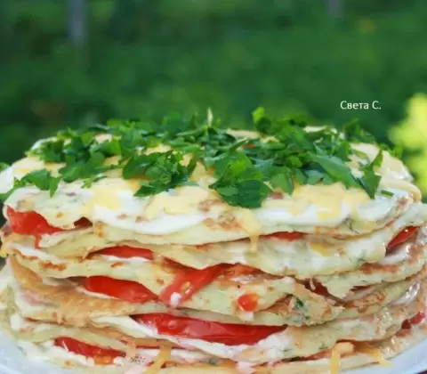 3. В ряде последующих этапов стоит заняться соусом: натереть чеснок и смешать его с майонезом. Этот соус станет отличной основой для укладки слоев. На каждый блин выкладывать щедро майонез, добавлять кружочки помидоров и посыпать тертым сыром. Строить торт, чередуя все слои, и окончательно украсить верхний слой майонезом, посыпав оставшимся сыром. По желанию можно запечь в духовке или нагреть в микроволновой печи на несколько минут для дополнительного эффекта.