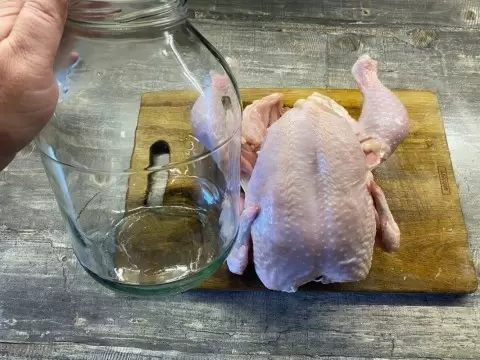 - Курица (или части куриного мяса) - 1,5 - 2 кг (такое количество идеально помещается в трехлитровую банку);