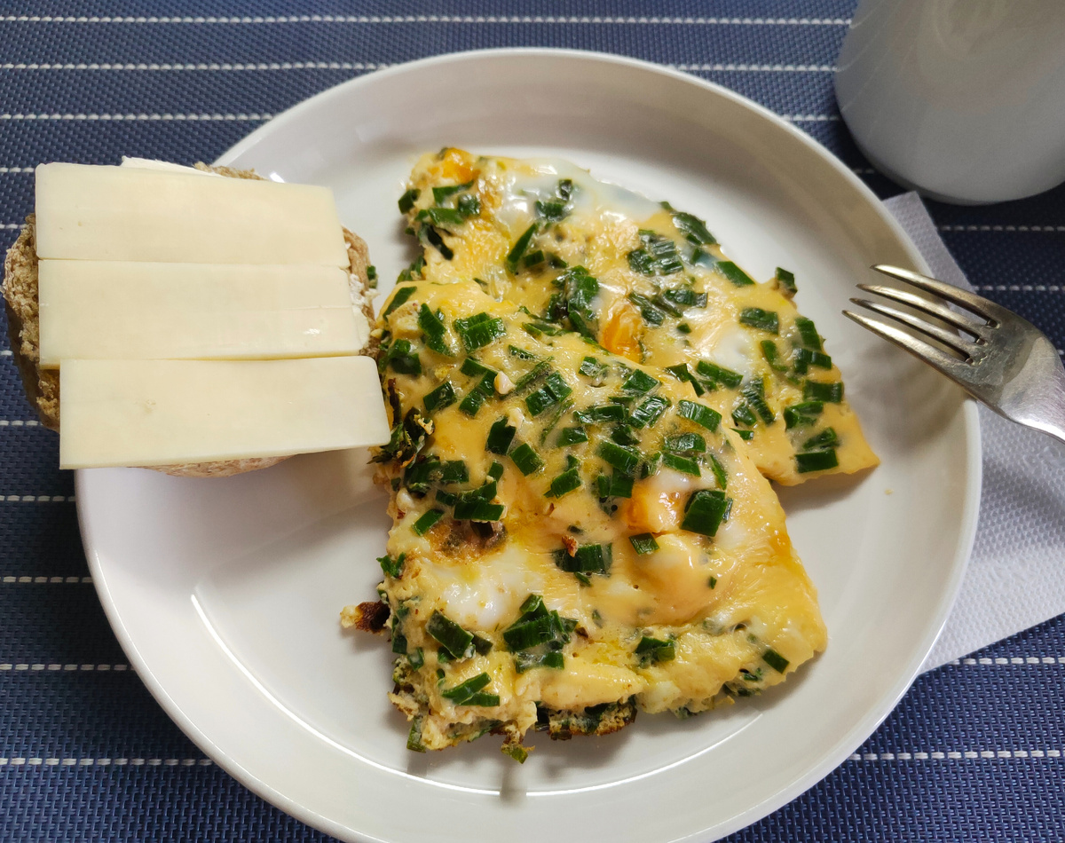 Завтрак: омлет с замороженным чесноком, сырный бутерброд и кофе.