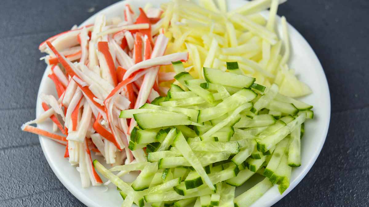 Важным моментом является выбор качественных крабовых палочек — они станут основой уникального вкуса. Если предпочитаете, можете заменить их на крабовое мясо. Не забудьте о свежих и сладких яблоках: лучший выбор — сорт Голден.