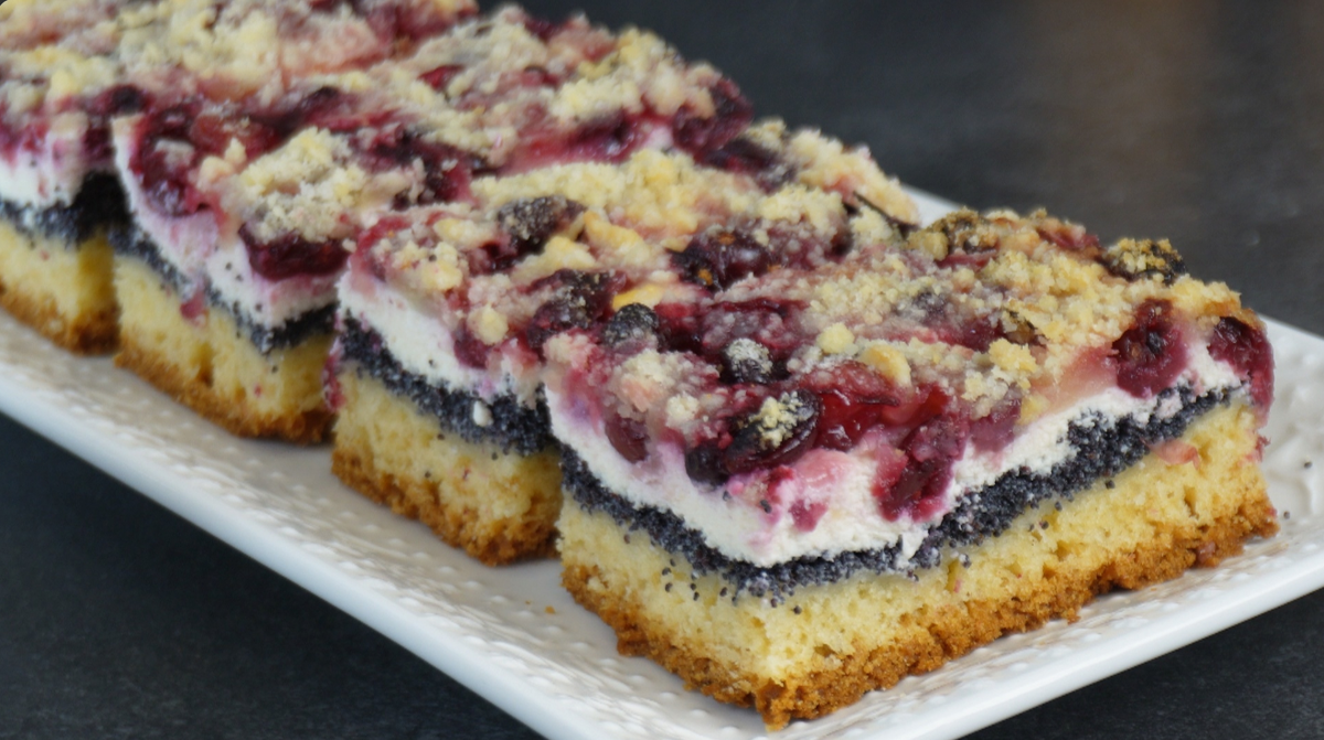Теперь соберите пирог: равномерно распределите маковую начинку в форме, сверху налейте творожную массу, затем добавьте ягоды. Наконец, посыпьте все штрейзелем.