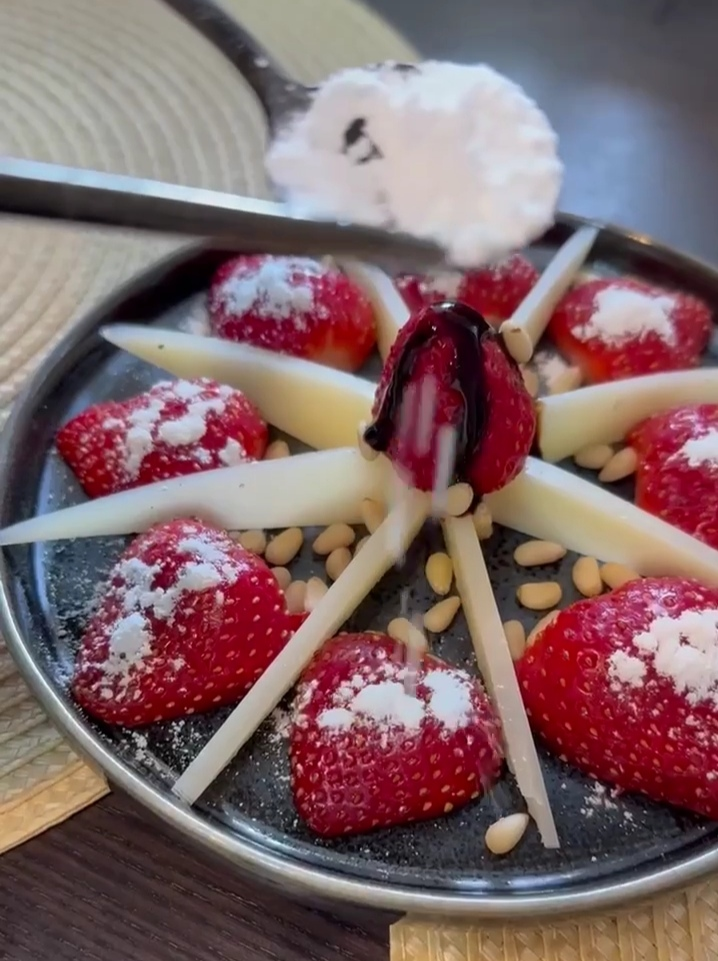 Слегка нарезанная клубника и тонкие ломтики сыра создают базовую структуру, которая подчеркивает сладость ягод и солоноватый оттенок сыра. Посыпанные кедровые орехи добавляют текстуру, а целая клубника с расплавленным шоколадным шармом становится центральной точкой композиции. Светлая пудра словно снег, который завершает образ и приносит лёгкость во вкус.