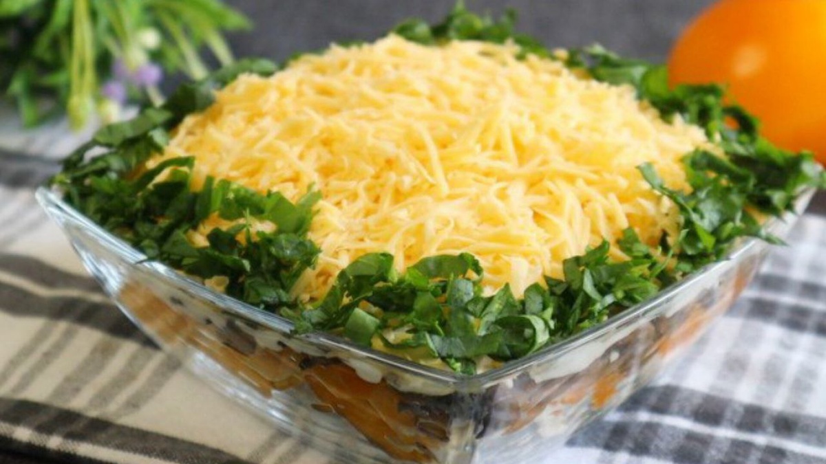 Пятый слой: Завершите творение щедрой порцией тёртого сыра и украсьте салат свежей зеленью.
