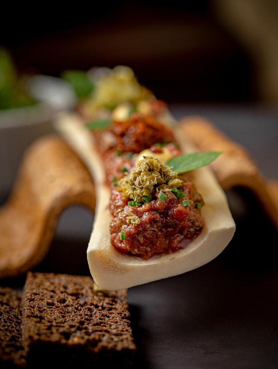 Что касается подачи, тартар из говядины представляется в аккуратной мозговой косточке. Такой стиль придает блюду не только визуальную привлекательность, но и создает интересное взаимодействие с традиционными элементами сервировки. В качестве дополнения подаются аппетитные тосты из бородинского хлеба. Это сочетание идеально дополняет текстуру и вкус тартар, создавая гармонию на тарелке.