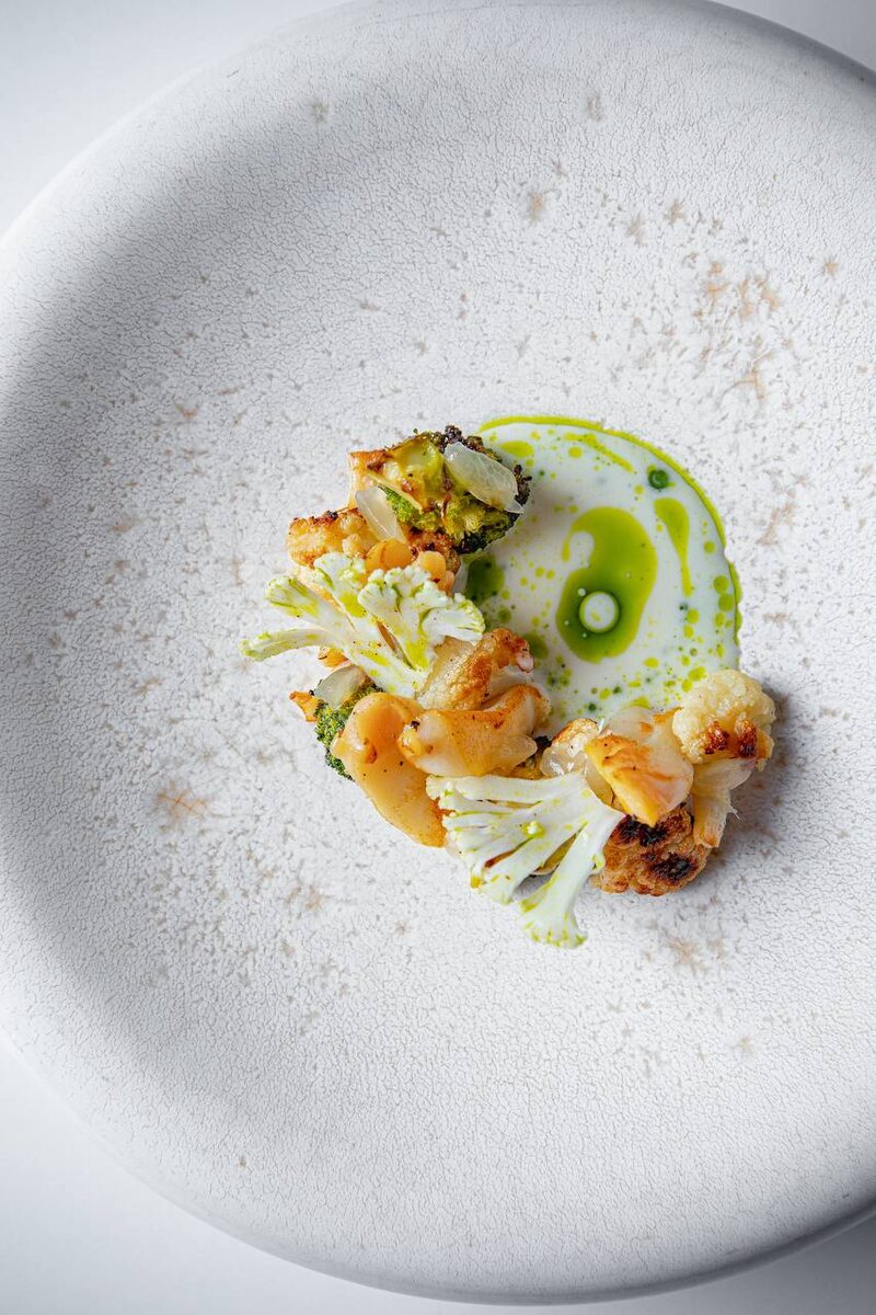 Кулинарный шедевр завершается соусом из копчёного сулугуни, который придаёт блюду дополнительную глубину. В качестве яркого дополнения выступает маринованный виноград, а также масло петрушки, добавляющее свежести и яркости вкусовой палитре.