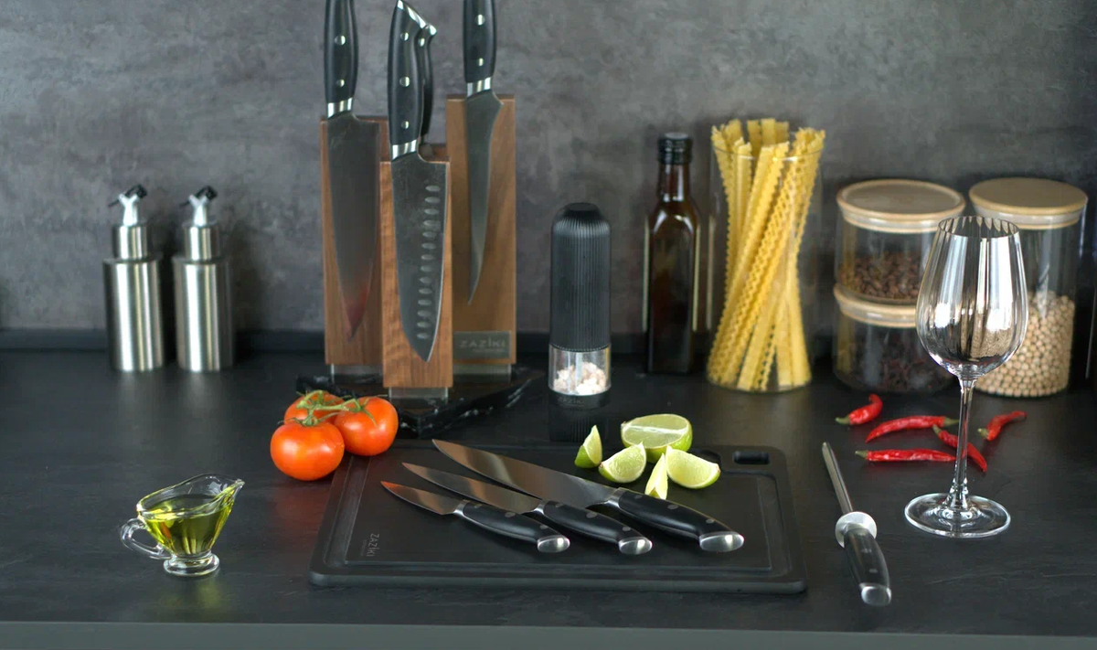 Первое, что стоит заменить, – это ножи, которые быстро теряют остроту. Часто покупая набор по привлекательной цене, люди спустя короткое время понимают, что справиться с обычными продуктами становится сложнее. Дешевые ножи из некачественной стали требуют частой заточки, и вскоре превращаются в бесполезный инструмент. В отличие от них, ножи ZAZIKI из твердой стали 61 HRC остаются острыми надолго, обеспечивая легкое и аккуратное нарезание. Их сбалансированная конструкция предотвращает усталость руки даже при длительной работе.