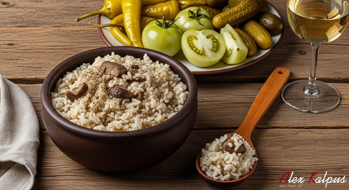 Приготовление: Грибы отвариваются, затем пассеруются с луком и чесноком, добавляются к рису и томятся под крышкой с добавлением дзиры.