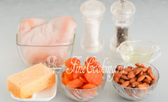 Далее натрите сыр на крупной терке и распределите его равномерно по куриной грудке. Сверху добавьте пюре из кураги и миндаль, предварительно нарезанный полосками. Сверните грудку в плотный рулет и обвяжите ниткой.