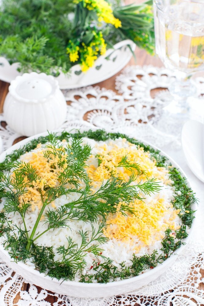 5. После картошки добавьте морковь с небольшим количеством майонеза. Завершите сборку белками, посыпьте сверху укропом и украсьте тертым желтком.