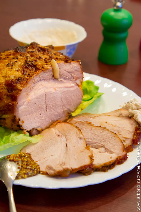 Сначала стоит измельчить чёрный и душистый перец, лавровый лист и соль в ступке или мельничке, затем тщательно натереть полученной смесью свиной окорок. Далее смешайте горчицу, хрен (желательно свеженатёртый) и оливковое масло, и равномерно намажьте этой смесью окорок, пишет Дзен-канал "Алексей Онегин ? Кулинарный исследователь".