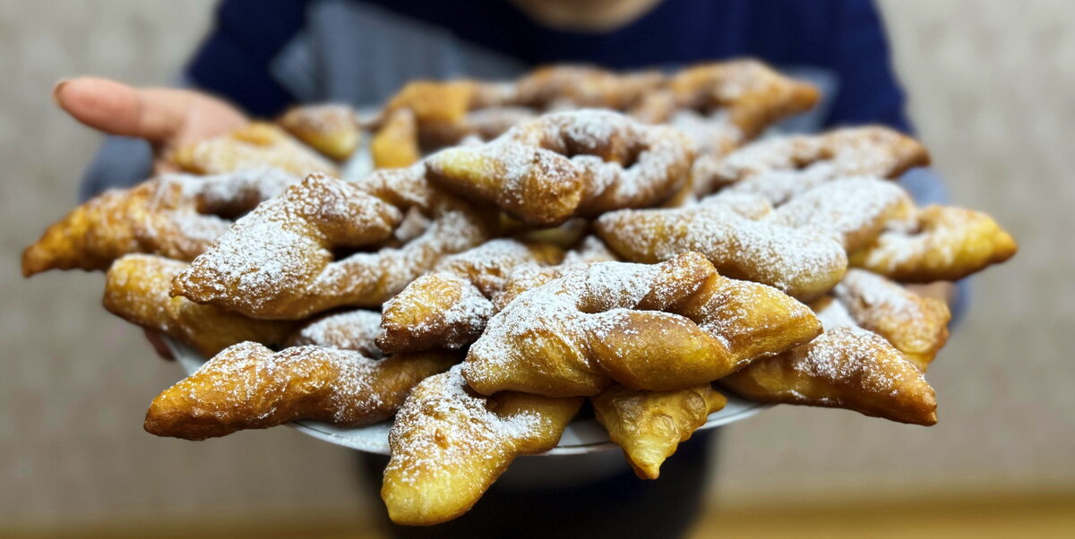 Утром раскатайте тесто толщиной 3-4 мм и нарежьте на ромбики. В центре сделайте небольшой надрез и аккуратно выворачивайте края, как показано в видео. Обжаривайте заготовки на растительном масле, постоянно переворачивая. После жарки выложите их на бумажное полотенце, чтобы избавиться от лишнего жира.