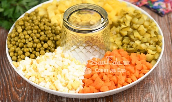 1. Приготовление можно начать с варки картофеля, моркови и куриных яиц. После остывания все ингредиенты очищаются и нарезаются кубиками. Их можно подавать как отдельно, так и на большой тарелке, распределяя по секциям.