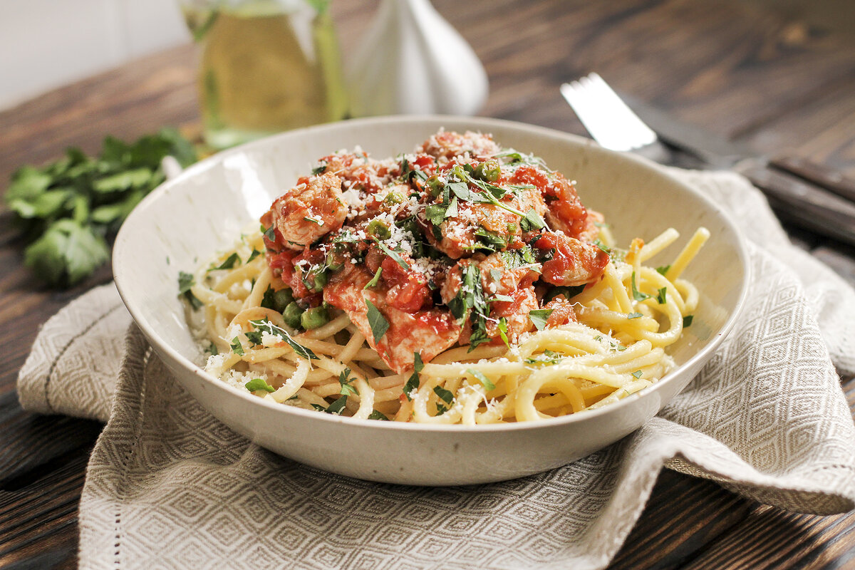 Подача: На тарелках выложить спагетти, сверху положить куриную начинку. Украсить тертым пармезаном и оставшейся петрушкой. Блюдо готово к сервировке!