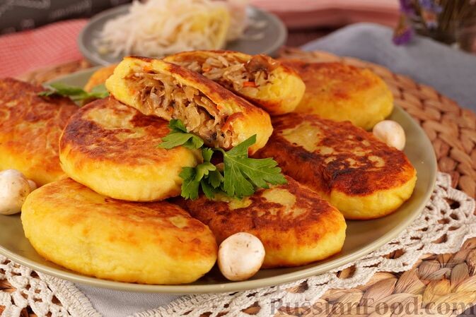 1. Картофельные зразы с капустой: Эти пирожки на основе картофельного пюре станут настоящим хитом. Квашеная капуста, тушенная с шампиньонами и луком, порадует любимыми вкусами в каждом укусе.