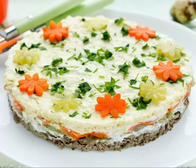 Салат можно украсить цветами из огурца и моркови, а также посыпать рубленой зеленью. Аккуратно убрать металлическое кольцо.