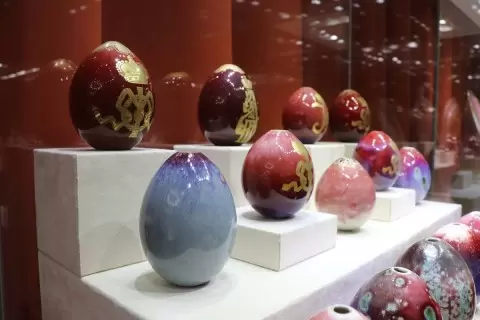Яйца из новой коллекции удивляют своей сложной техникой глазури, известной как «сан-де-бёф» или «бычья кровь». Этот метод был разработан в Китае в начале XVIII века и отличается неожиданными, но зрелищными эффектами.