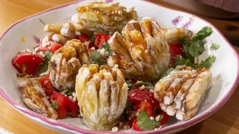 Пока баклажаны остывают, нарезаем крупно томаты и мелко шинкуем кинзу. Смешиваем их в миске, добавляем немного соуса Sweet Chili и пару капель лимонного сока. Остывшие баклажаны вновь опускаем в горячее масло на 2-3 минуты и снова выкладываем на бумагу, чтобы убрать излишки масла.