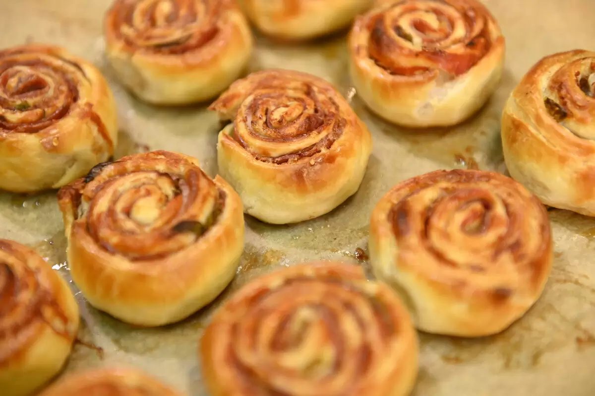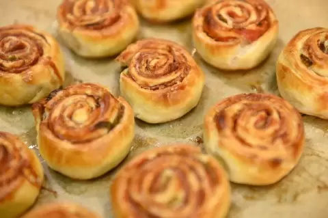Начать стоит с подготовки колбасы: её нужно нарезать очень тонкими кружочками или овалами. Так рулетики будут выглядеть аккуратно и аппетитно.Далее на стол желательно положить пленку или просто посыпать его мукой и раскатать слоеное тесто в прямоугольный пласт. Это придаст рулетикам идеальную форму.На развернутое тесто равномерно выкладываются кусочки колбасы, причем их можно укладывать внахлест, чтобы каждая порция была насыщенной.После этого следует нарезать зеленый лук и посыпать им подготовленную колбасу. Лук добавит свежести и аромата.Настало время формировать рулет: нужно аккуратно закручивать тесто с начинкой, начиная с одного края. Чем туже получится закрутить, тем красивее и аккуратнее будут готовые рулетики.Рулет следует нарезать на несколько кружочков и выложить их на противень, предварительно застеленный пергаментом для выпечки.Чтобы рулетики выглядели более аппетитно, их стоит смазать смесью из яйца с небольшим количеством воды или молока. Это придаст им красивую золотистую корочку.Выпекать рулетики нужно в заранее разогретой до 180 градусов духовке в течение 10-15 минут. Как только они станут золотистыми, можно смело подавать на стол!Эти восхитительные слоеные рулетики с колбасками — идеальное решение для любой вечеринки или семейного ужина. Простота приготовления и отличный вкус сделают их любимым лакомством для всех!