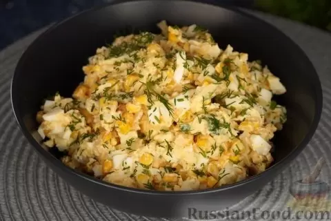 - Салат с кукурузой, яйцами и двумя сырами. Этот легкий и сытный салат станет настоящим открытием. Смешивание консервированной кукурузы с вареными яйцами и двумя видами сыра создаёт уникальный вкус, который порадует даже самых привередливых гурманов.