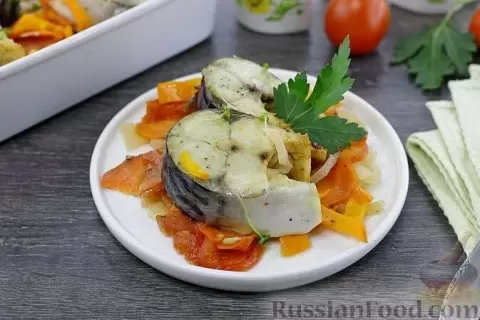 - Скумбрия на овощной подушке: Это блюдо сочетает в себе нежное филе скумбрии, запеченное на подушке из свежих овощей. Сладкий перец, морковь и помидоры создают яркий вкус и делают рыбное блюдо более насыщенным.