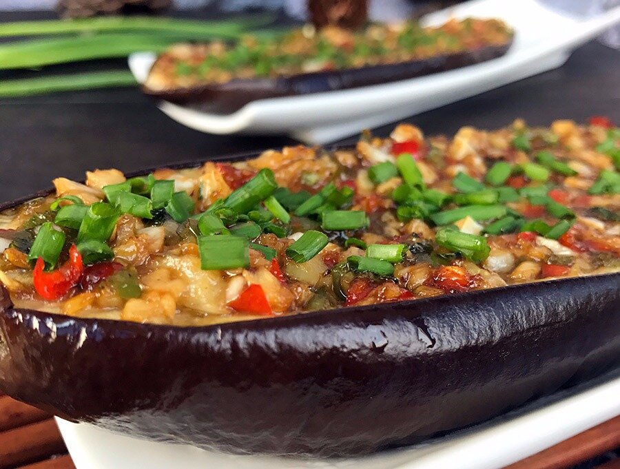 Для начала баклажан необходимо разрезать вдоль на две половинки. Внутри сделать аккуратные надрезы, стараясь не повредить кожицу. После этого поверхности баклажана щедро смазываются растительным маслом. Подготовьте пароварку или нагрейте духовку до 180°C, поместив в нее миску с горячей водой.Пока баклажан готовится, следующее, что нужно сделать – это мелко нарезать чеснок, зеленый лук (оставив немного для финальной подачи) и перец чили. Смешайте их в глубокой миске, приправьте солью, добавьте устричный соус и немного растительного масла. Перемешайте до однородной массы.На подготовленные баклажаны выложите ароматную овощную смесь и поместите противень в разогретую до 200°C духовку, расположив его на верхнем уровне. Запекайте в течение 20 минут, чтобы баклажан стал мягким, а верх корочкой – хрустящим.Готовое блюдо аккуратно перенесите на сервировочное блюдо и украсьте оставшимся зеленым луком или другой свежей зеленью по вашему выбору.Приятного аппетита!