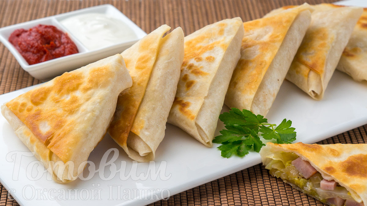 Теперь пришло время формировать пирожки. Лист лаваша нарежьте на полоски шириной 8-10 см. На одну полоску выложите начинку и сверните в треугольник. Подворачивайте кончики, чтобы начинка не выпала во время жарки. Обжаривайте пирожки на раскаленной сковороде с небольшим количеством масла до золотистой корочки с обеих сторон, примерно по 30 секунд на каждую сторону.