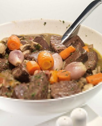 Начать с нарезки говядины крупными кубиками, а репчатый лук — полукольцами. Чеснок стоит просто слегка раздавить. Все ингредиенты, включая веточки петрушки, лавровый лист, тимьян и черный перец, поместить в глубокую миску и залить красным вином. Хорошо перемешать и оставить в холодильнике на сутки для маринования.По истечении времени аккуратно обсушить мясо и нарезанный бекон обжарить на растительном масле до золотистой корочки. Затем извлечь бекон и на том же жиру обжарить говядину до образования корочки. Добавить муку и продолжать жарить еще минуту.Переложив мясо в сотейник, процедить маринад через сито и добавить к говядине вместе с беконом. Тушить на медленном огне около полутора часов. В это время крупно нарезанную морковь обжарить на смеси оливкового и сливочного масел до золотистой корочки, добавить к мясу и тушить еще двадцать минут.Обжарить лук-шалот и добавить к мясу, повторяя процесс. На завершающем этапе обжарить пополам нарезанные шампиньоны и добавить их в сотейник. Проверить на вкус, при необходимости подсолить и поперчить, и продолжить тушение еще 20-25 минут. Блюдо готово!Говядина по-бургундски отлично сочетается с картофельным пюре или рисом. Приятного аппетита!